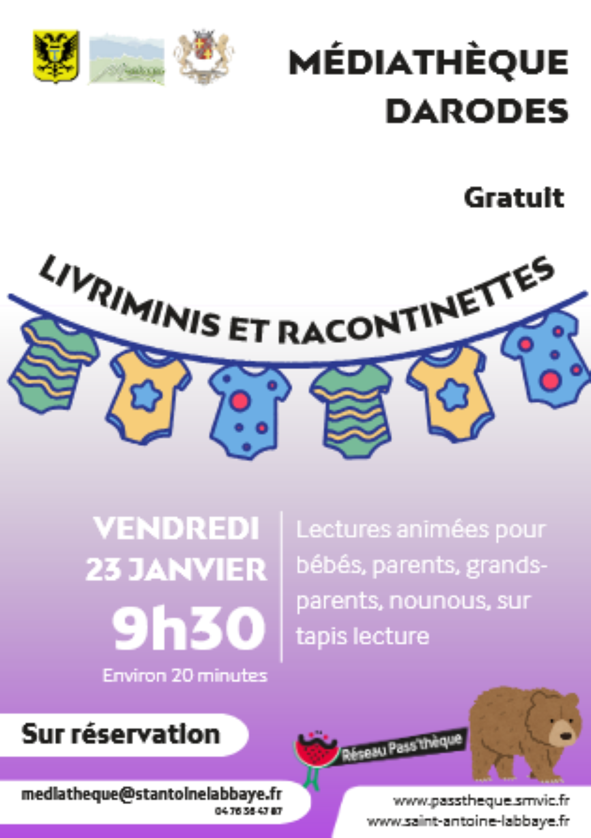 Amélie,bibliothécaire, vous invite à une Lecture musicale animée sur le thème de l'ours, pour les tout-petits de 0 à 3 ans, accompagnés de leurs nounous, parents, grands-parents. Entrée libre et gratuite, sur réservation. Durée environ 20 minutes, suivi d'une pause rafraichissement, et de prêts de livres.